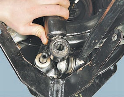 2. Отверните гайки крепления стоек стабилизатора к нижним рычагам подвески и извлеките пальцы шарниров из отверстий кронштейнов на рычагах.