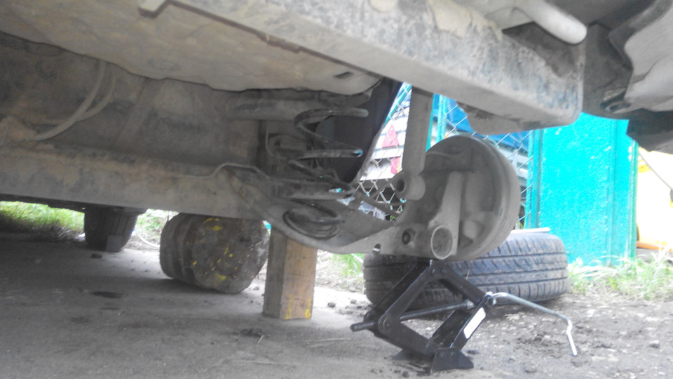 Если нет специального приспособления, можно попробовать открутить болт заднего амортизатора, опустить балку домкратом и высвободить пружину.