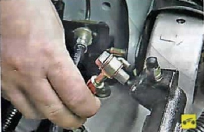 1. Выверните болт-штуцер и отсоедините от рабочего цилиндра шланг. Заглушите шланг, чтобы не вытекала тормозная жидкость.