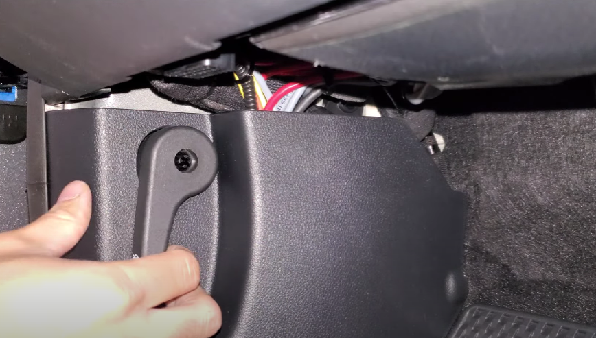 3. С другой стороны аккуратно подденьте плоской отверткой или другим подходящим инструментом, пока ручка открывания капота Креты не будет легко сниматься со стойки.