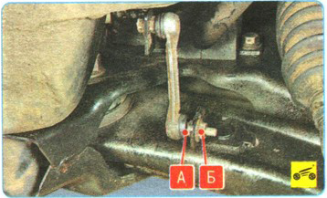 21. Отверните гайку Б крепления стойки датчика системы коррекции света фар, удерживая вторым ключом палец А шарового шарнира за шестигранник...
