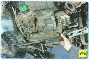 35. Выверните три болта крепления задней опоры подвески силового агрегата к поперечине...