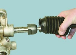 6. Отверните корпус шарнира рулевой тяги, удерживая рейку от проворачивания вторым ключом, и снимите рулевую тягу Чери Амулет. При необходимости замены снимите с тяги защитный чехол.
