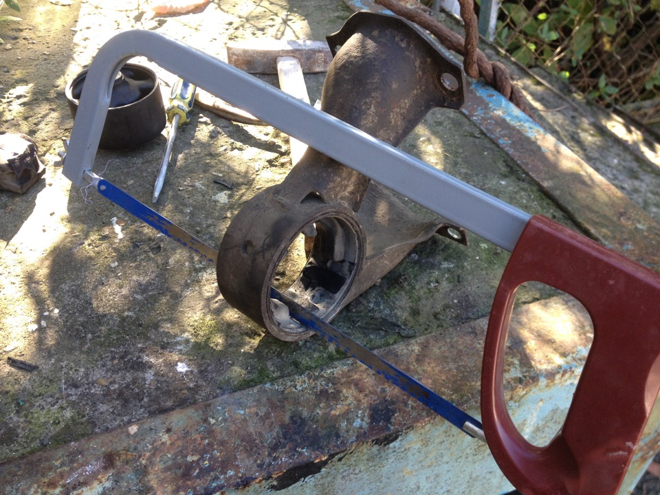 Достаем опору, распиливаем ножовкой внутреннее кольцо и выбиваем старый сайлент. Затем запресовываем новый. Я забивал молотком через старое кольцо, предварительно смазав макитовской смазкой (другой не было). Шло медленно, но уверенно. По ощущениям довольно надежно. Сборка в обратном порядке. Собрал все очень быстро, второй раз поменяю уже быстрее.