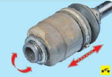 - …или правого переднего колеса должен перемещаться в угловых и осевых направлениях с легким усилием, при этом не должно ощущаться рывков, заеданий и радиальных люфтов. В противном случае замените внутренний шарнир;