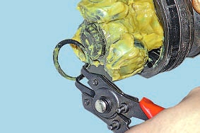 11. Для разборки и замены внутреннего шарнира снимите хомуты крепления чехла шарнира к его корпусу. Сожмите бокорезами или пассатижами выступы хомута и, поддев отверткой, выведите фиксаторы хомута из прорезей. Снимите хомут.