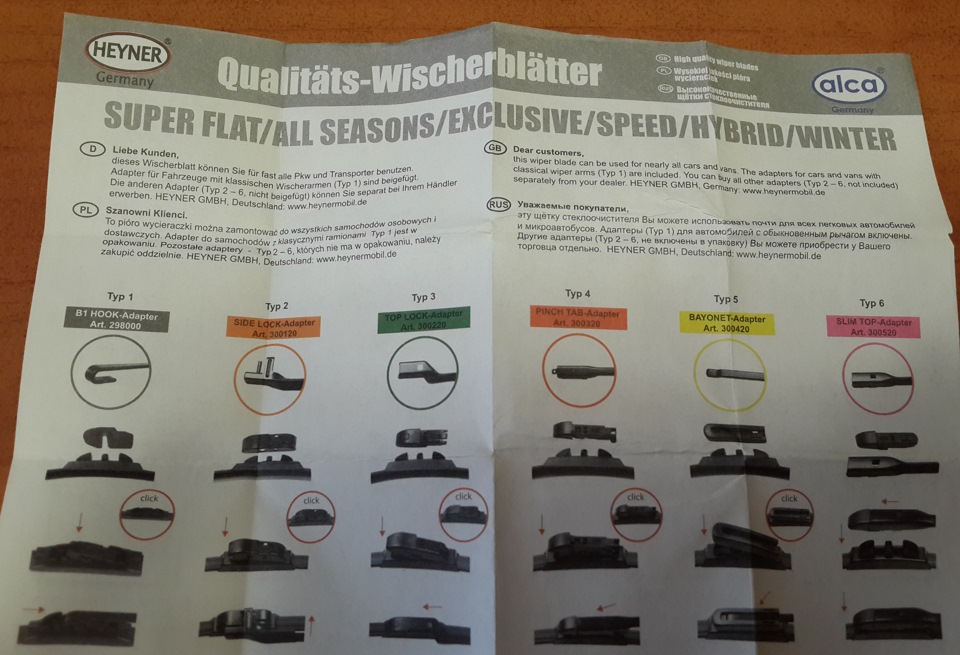 На протяжении всей зимы постоянно замечал, что родные дворники не справляются со своими прямыми обязанностями. Особенно плохо щетки работают при минусовой температуре (-2-3 и если идёт снег). Маленькие канавки забиваются, замерзают, чем дальше — тем больше и щетки оставляют дикие пропуски, из-за чего безопасность и комфорт управления исчезает напрочь. Долго мерился с такой особенностью, зная, что без переходника новые щетки не поставить. Неделю назад зайдя в авто магазин увидел кучу разных переходников для дворников и… выбрал нужный. Далее пообщавшись с продавцом узнал какие щетки стеклоочистителя стоит приобретать, а какие нет. (Порекомендовал он мне фирму Alca/Heyner). Alca`ой пользовался на прошлых авто и нареканий не было, а вот про Heyner я ничего не знал. Покупать щетки не стал т.к. нужных размеров не было, да и цены в розничном магазине были космические, купил лишь переходник. Окончательно определился с выбором.