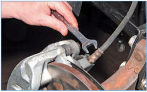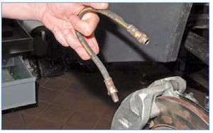 Перед выворачиванием штуцера тормозной трубки из верхнего наконечника шланга металлической щеткой очищаем место их соединения от грязи и коррозии и наносим на него легкопроникающую жидкость типа WD-40.