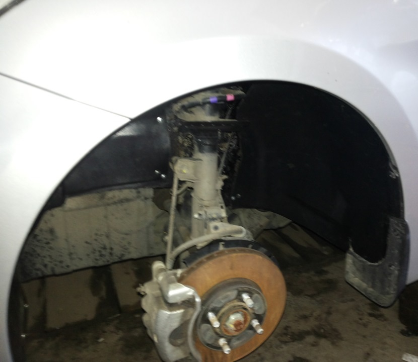 2. Ослабьте затяжку гаек крепления колес, приподнимите переднюю часть автомобиля с помощью домкрата, установите автомобиль на надежные опоры, и снимите колесо.