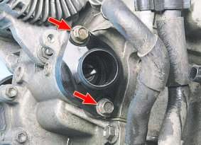 6. Выверните 2 болта крепления корпуса термостата Ниссан Кашкай к двигателю.