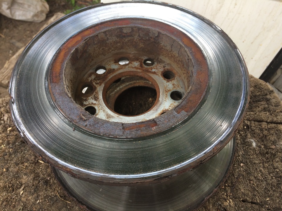 Пришло время менять и задние тормозные диски, которые изрядно износились, заодно и колодки по кругу. До ТО 105000 км ждать не стал. Тем более появился скрип сзади справа, как раз из района тормозных механизмов. Необходимо вернуть в начальное положение тормозной цилиндр в суппорте. Просто так его не вдавить туда (как спереди). Необходимо его одновременно вращать и вдавливать, для этого на нем имеются две риски. Так как профессионального инструмента не было, пришлось делать самодельный — для этого понадобились болт, гайка, шайба и пара стальных широких пластин (для упора). Последующим вращением болта цилиндр вдавливался внутрь суппорта, а ключом от болгарки (идеально подошел) он вращался.