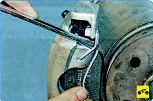 На тормозном механизме мод. FN3 отверткой извлеките отогнутые концы пружинного фиксатора наружной колодки из отверстий суппорта...