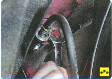 5. Выверните болт-штуцер крепления наконечника шланга к рабочему цилиндру тормозного механизма переднего колеса...