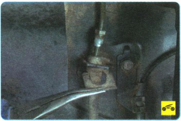 9. Сожмите пассатижами пружинный фиксатор крепления тормозного шланга к кронштейну амортизаторной стойки...