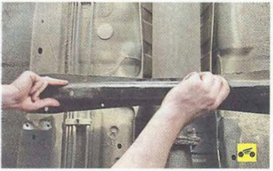 5. Выверните болты крепления поперечной балки кузова к правому и левому лонжеронам и снимите балку с автомобиля.