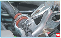6. В моторном отсеке, поддев шлицевой отверткой втулку оболочки троса, выводим втулку из уплотнителя в щитке передка.