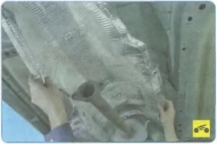 Рис. 6.6. Разрезание шумоизоляционной обивки тоннеля пола для получения доступа к креплению уплотнителя тросов управления коробкой передач.