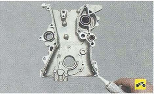 15. Установите крышку цепи газораспределительного механизма в обратном порядке, предварительно очистив ее от остатков старого герметика, заменив уплотнительные кольца и нанеся новый герметик, как показано на фото.