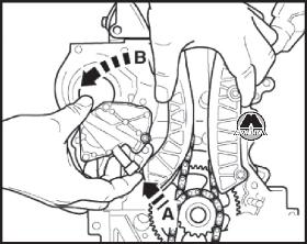 2. Затем надавить на плунжер в направлении стрелки А, после чего провернуть корпус натяжителя в направлении стрелки В, чтобы установить его в исходное положение.