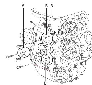 - 5. Выверните болты крепления и снимите шкив А водяного насоса, кронштейн Б правой опоры подвески силового агрегата и шкив В коленчатого вала.