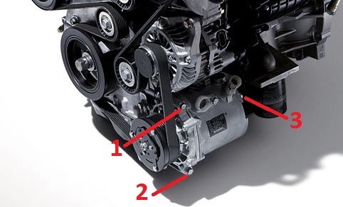 5. (для двигателя 4B12) Головкой на 12 мм ослабьте болты крепления компрессора кондиционера и электромагнитной муфты в сборе в последовательности, указанной на рисунке ниже (для наглядности показано на снятом двигателе).