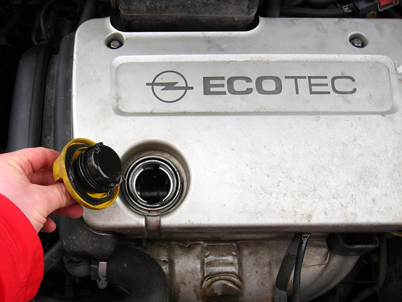 1. Установите автомобиль на горизонтальной площадке, дайте двигателю остыть и откройте капот. Крышка маслозаливной горловины Опель Астра G расположена на головке блока цилиндров с правой стороны.