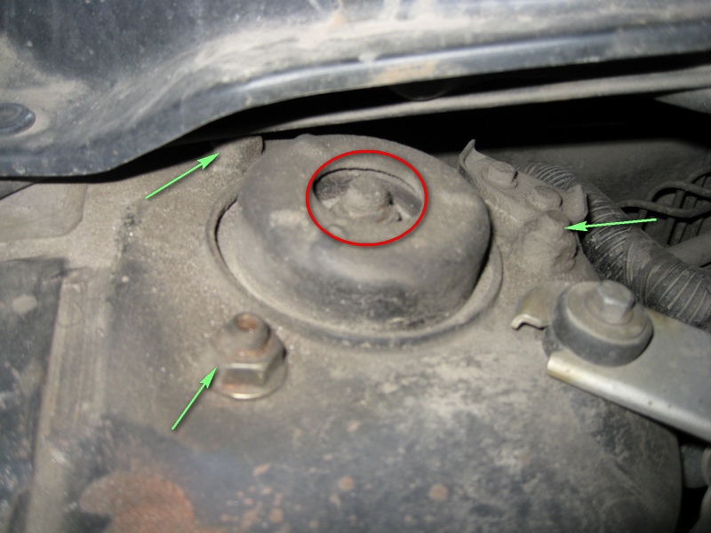 4. Открываем капот и откручиваем три гайки (зеленые стрелки), крепящие стойку сверху, используя головку и ключи на 16. Также рекомендую слегка ослабить центральную гайку стойки (обозначена красным) кривым ключом на 17, для последующей более удобной разборки стойки.