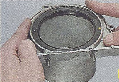 5. Установите заднюю крышку сальником на оправку подходящего диаметра и выпрессуйте сальник из крышки.