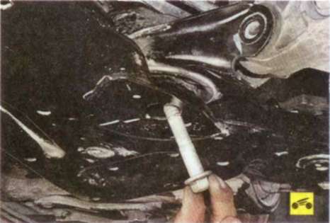 5. ...и извлеките болт крепления опоры к поперечине передней подвески.