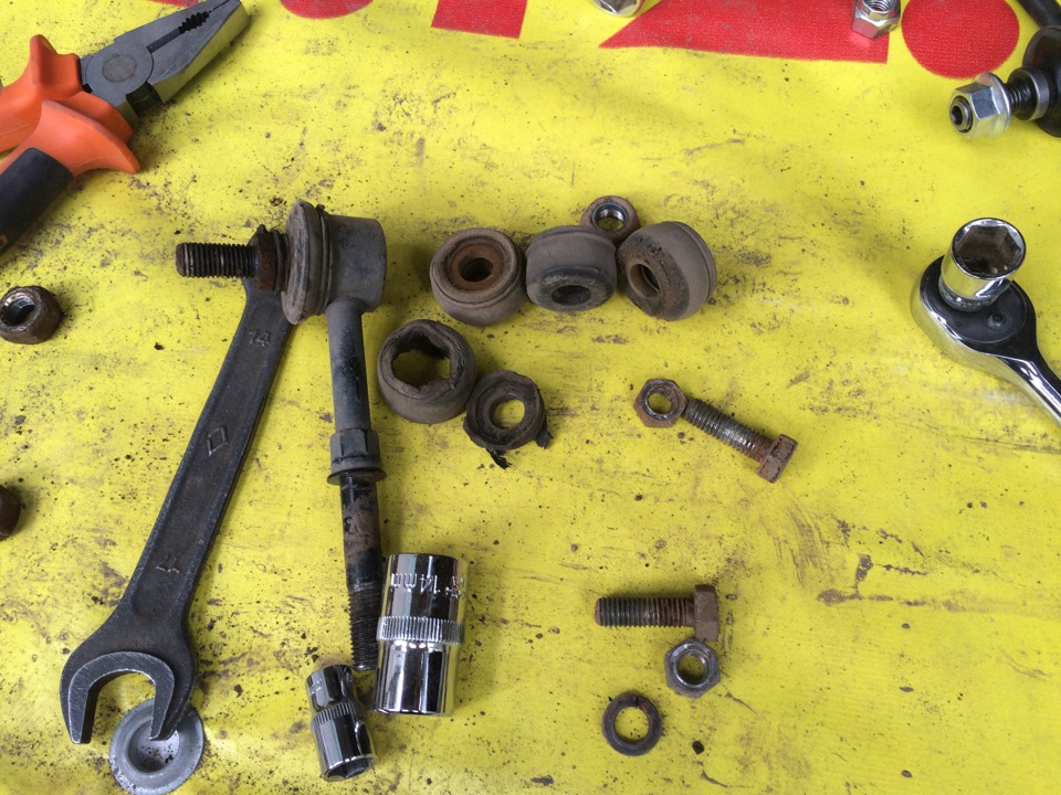 Сначала прикрутил сами косточки на стабилизатор, а потом все это втыкал под машину и прикручивал на втулки и нижние болты стоек.