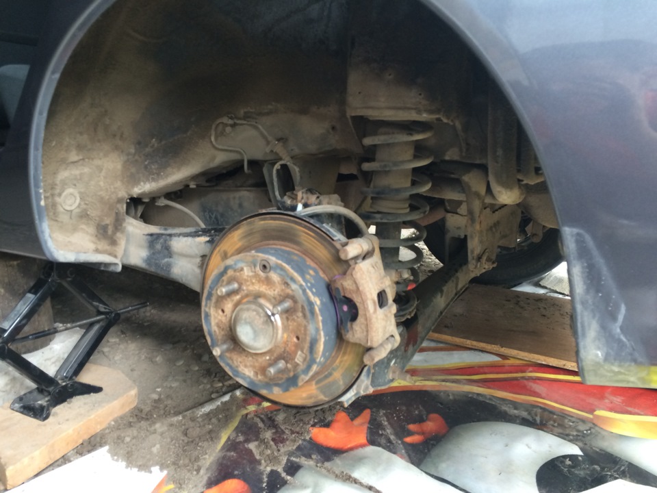 Снял левое заднее колесо и начал откручивать старые болты, предварительно побрызгав вэдэшкой и чуть подождав.