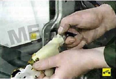 14. Нажмите на фиксатор колодки жгута проводов электропривода блокировки замка двери...