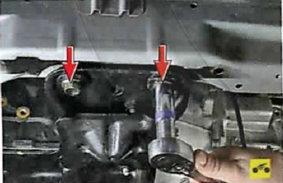 2. Выверните болт крепления передней опоры двигателя к кронштейну на блоке цилиндров.