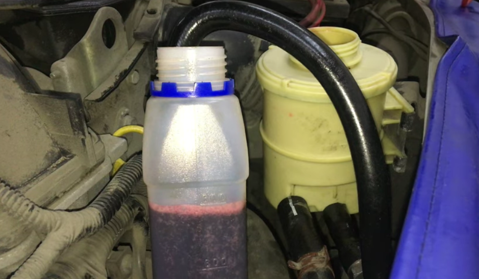 13. Поворачивайте руль поочередно в обе стороны до упора. Тем временем в бутылку будет выходить грязная жидкость (около 400 г).