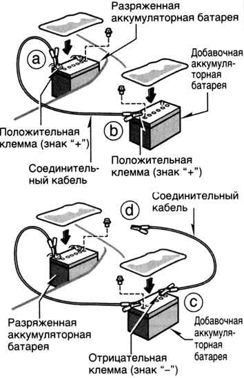 1. Если добавочная аккумуляторная батарея установлена на другом автомобиле, убедитесь, что автомобили не соприкасаются друг с другом. Выключите все ненужные световые приборы и вспомогательное оборудование.